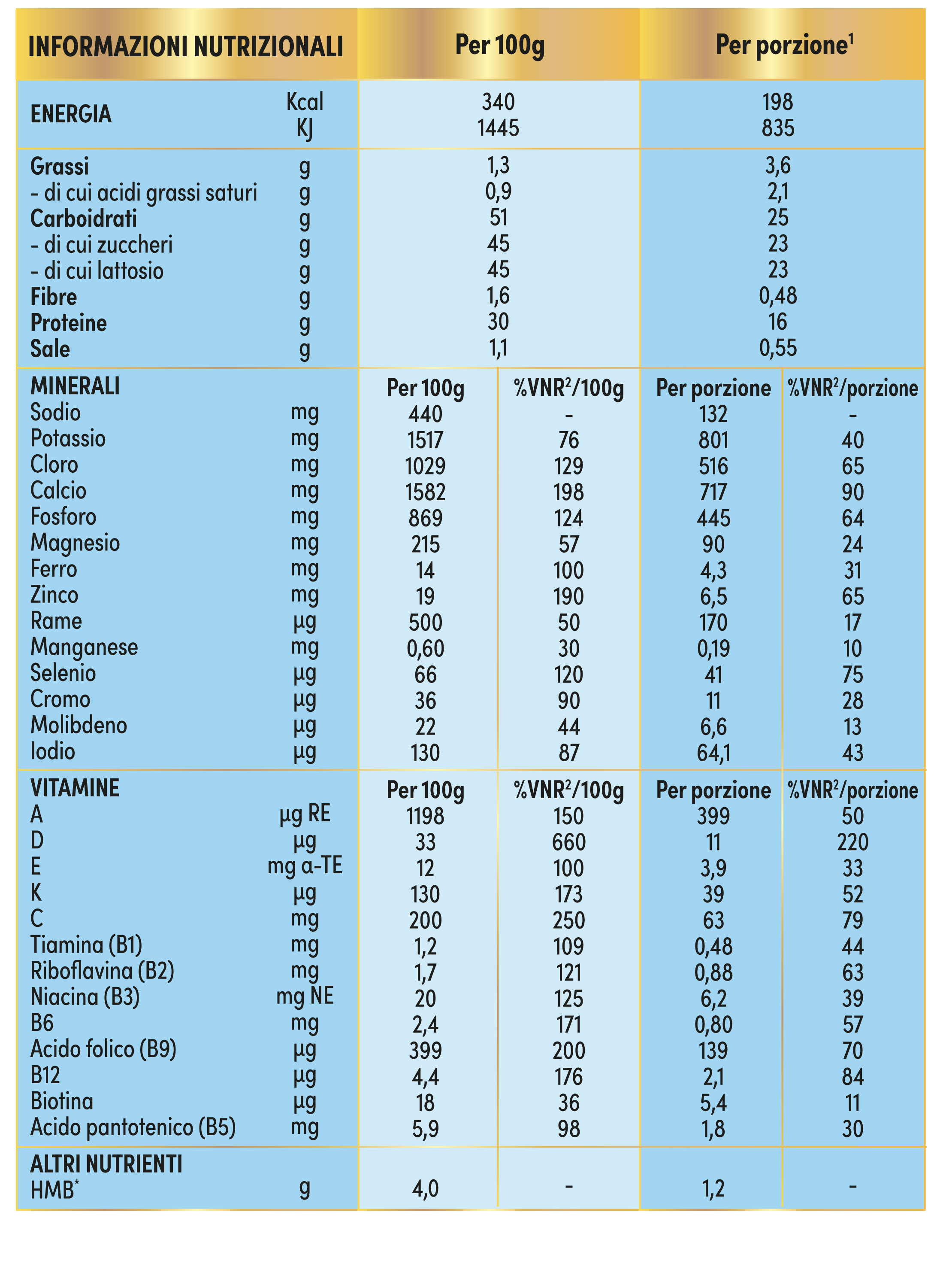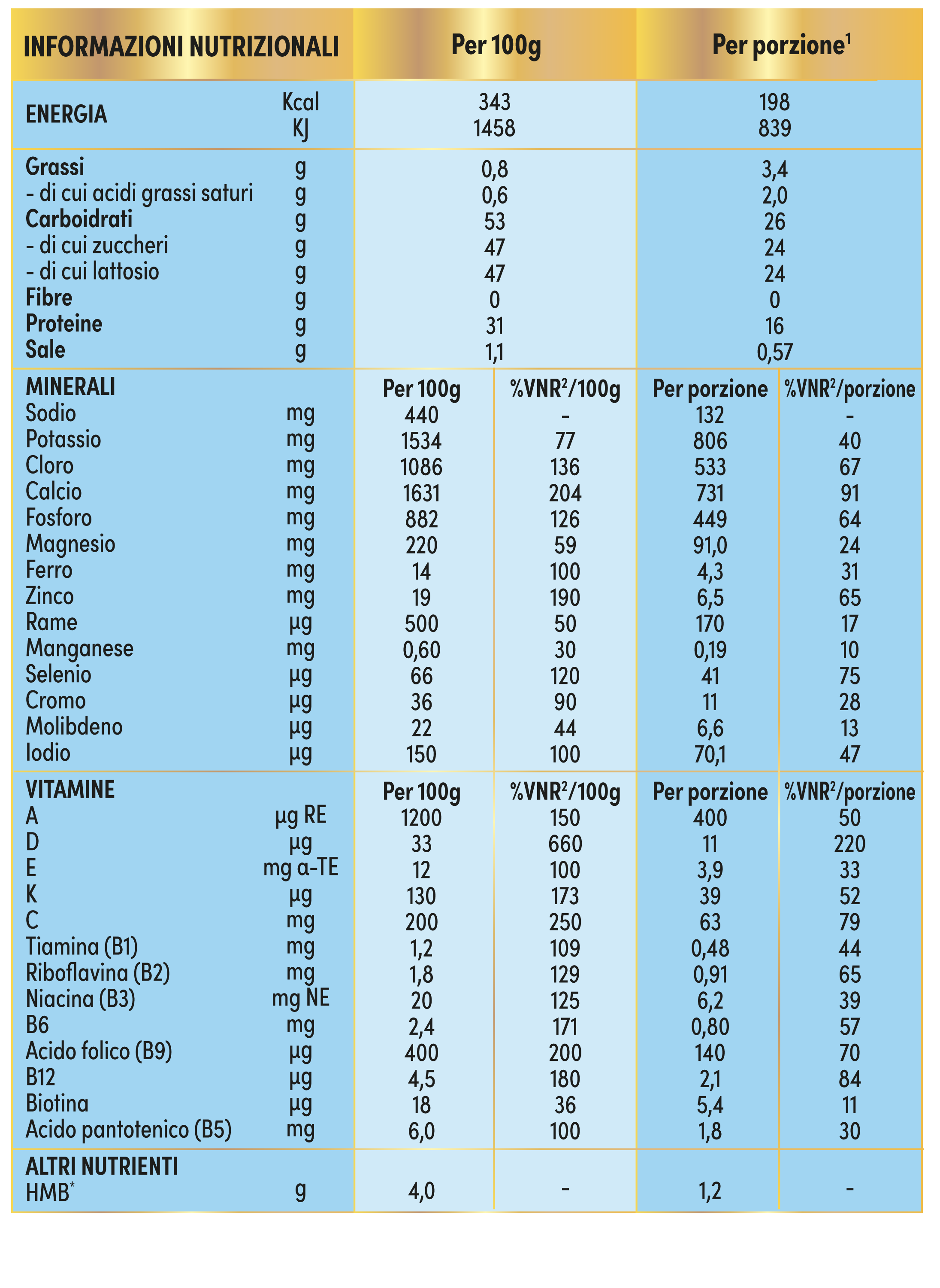Latte scremato, CaHMB (calcio beta-idrossi-beta-metilbutirrato monoidrato), minerali (citrato di magnesio, molibdato di sodio , solfato di rame, solfato di zinco, solfato ferroso , solfato di manganese, cloruro di cromo, selenito di sodio), vitamine (acido pteroil-monoglutammico, L-ascorbato di sodio, riboflavina, acetato di DL-alfa-tocoferile, colecalciferolo, nicotinamide, acetato di retinile, D-biotina, D-pantotenato di calcio, fillochinone, cloridrato di piridossina, cianocobalamina, cloridrato di tiamina), aroma: vaniglia, edulcorante: acesulfame K.